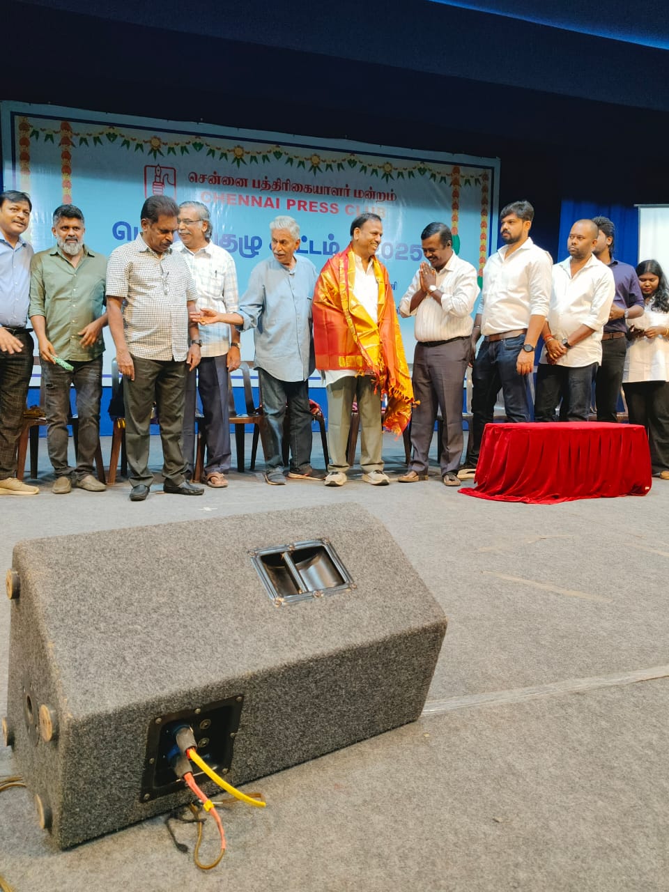 சென்னை பத்திரிகையாளர்கள் மன்றம் சார்பில் 40 ஆண்டுகளுக்கு மேலாக பத்திரிகை துறையில் பணியாற்றிய மூத்த பத்திரிகையாளர்களை கௌரவப்படுத்தினார்கள். அப்பொழுது அக்னிமலர்கள் ஆசிரியர் ஆர்.பன்னீர்செல்வம் அவர்களுக்கு மூத்த பத்திரிகையாளர் பகவான்சிங் பொன்னாடை அணிவித்து மரியாதை செய்தார். உடன் பத்திரிகையாளர் மன்ற தலைவர் சுரேஷ் வேதநாயகம், செயலாளர் ஆசிப் மற்றும் மன்ற நிர்வாகிகள் அருகில் உள்ளனர். (15.11.2025) அன்று ஜானகி எம்.ஜி.ஆர் கலைஅறிவியல் கல்லூரி வளாகத்தில் உள்ள எம்.ஜி.ஆர் அரங்கில் நிகழ்ச்சி நடைபெற்றது. மன்ற உறுப்பினர் கலந்து கொண்டு பொதுக்குழு கூட்டமும் நடைபெற்றது. கூட்டத்தில் பல்வேறு தீர்மானங்கள் நிறைவேற்றப்பட்டது. மூத்த பத்திரிகையாளர்களும், ஏராளமான உறுப்பினர்களும் கலந்து கொண்டார்கள். நிகழ்ச்சி ஏற்பாடு செய்த பத்திரிகையாளர் மன்ற நிர்வாகிகளுக்கு வாழ்த்துக்களையும், பாராட்டுகளையும் அக்னிமலர்கள் தெரிவித்து கொள்கிறது.
